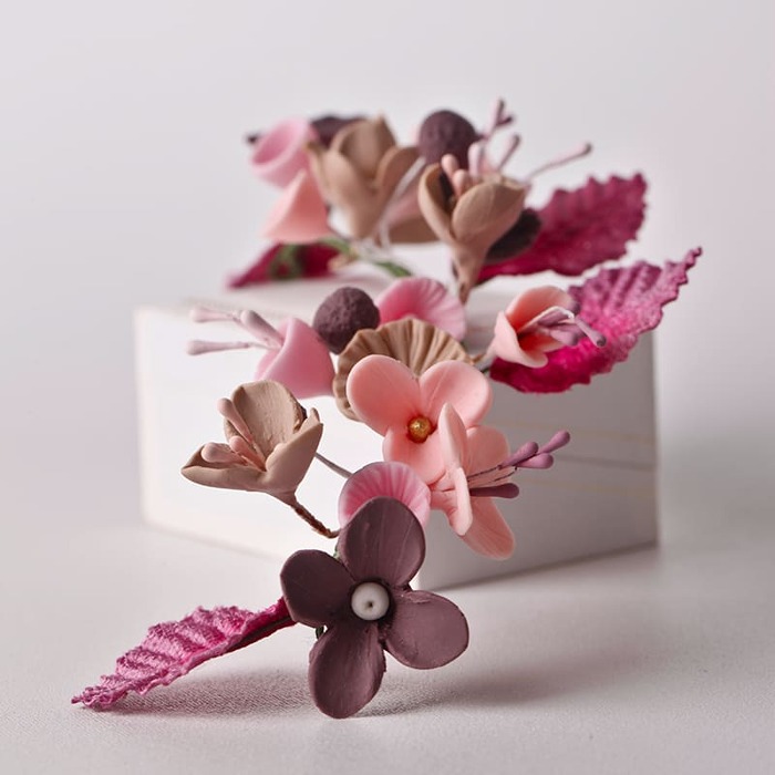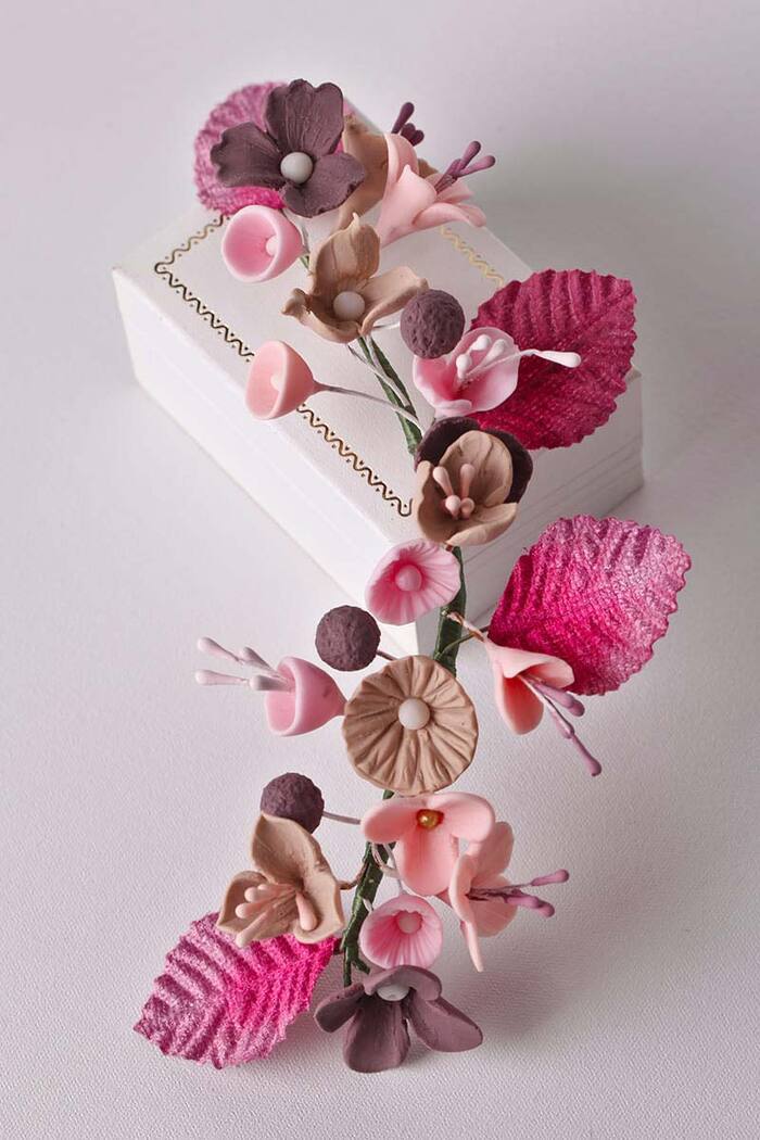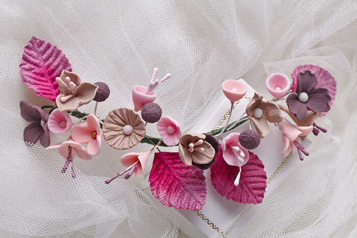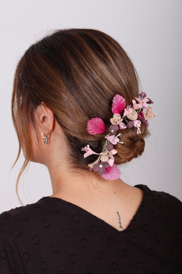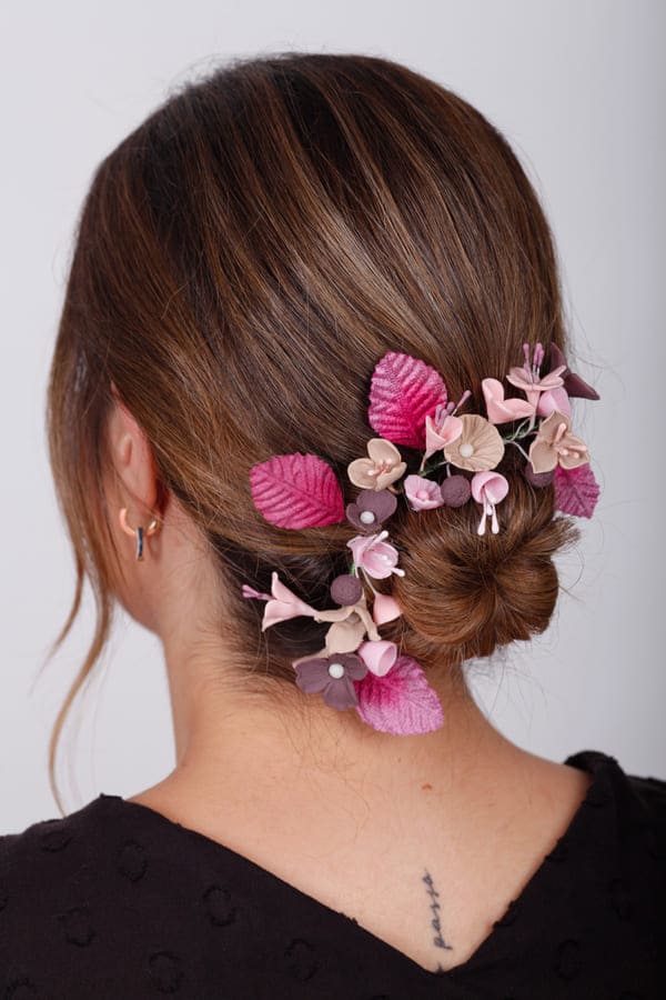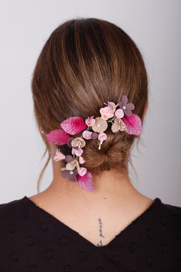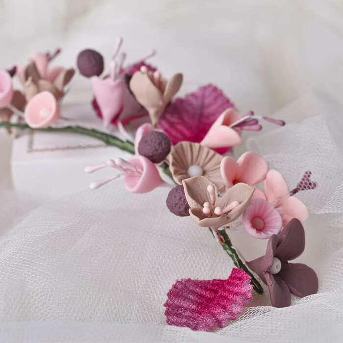 Tocado de flores artesanales de porcelana fría en gama de rosados y morados.